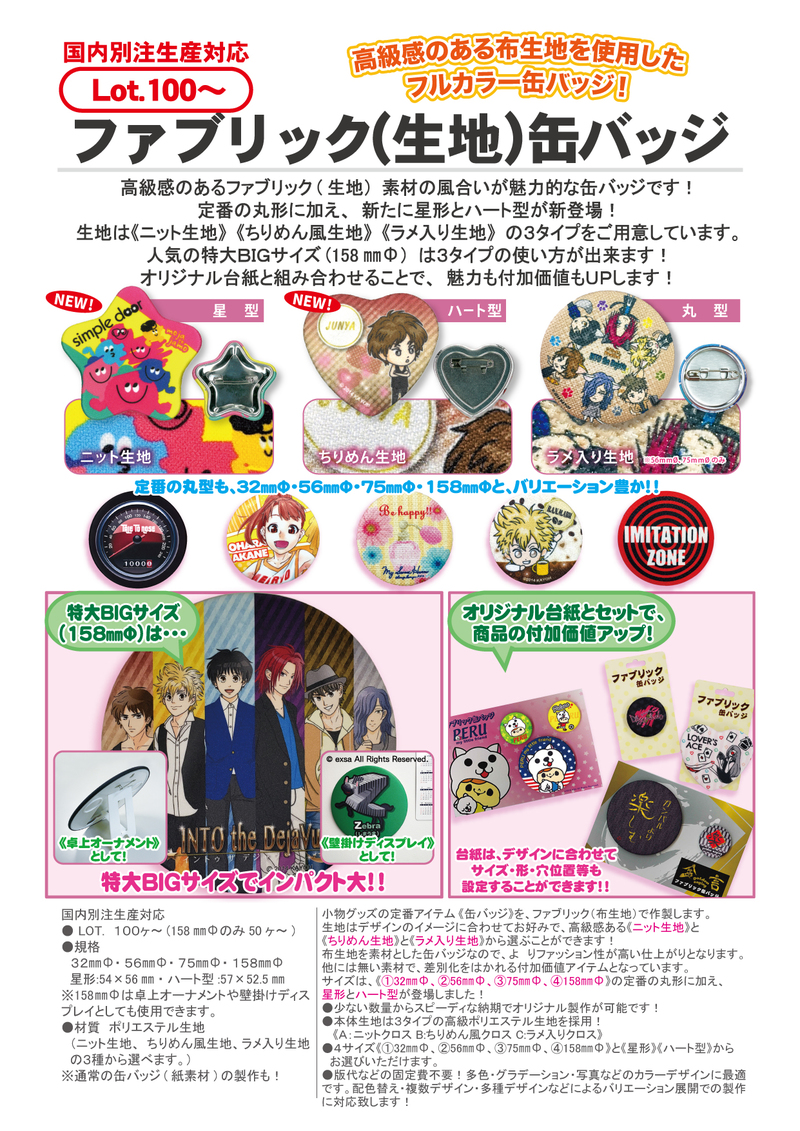 布生地を素材とした缶バッジなので、よ りファッション性が高い仕上がりとなります。他には無い素材で、差別化をはかれる付加価値アイテムとなっています。