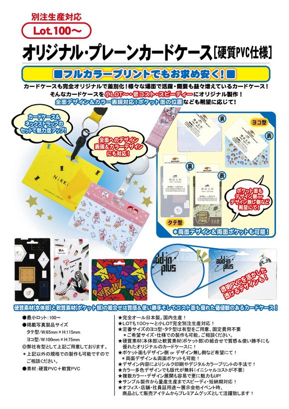 ★弊社既製型(名刺&ICカードサイズ等広く対応したサイズ)をご用意! ★素材は軟質カラードPVC(白他既製原反カラーより)+透明PVC