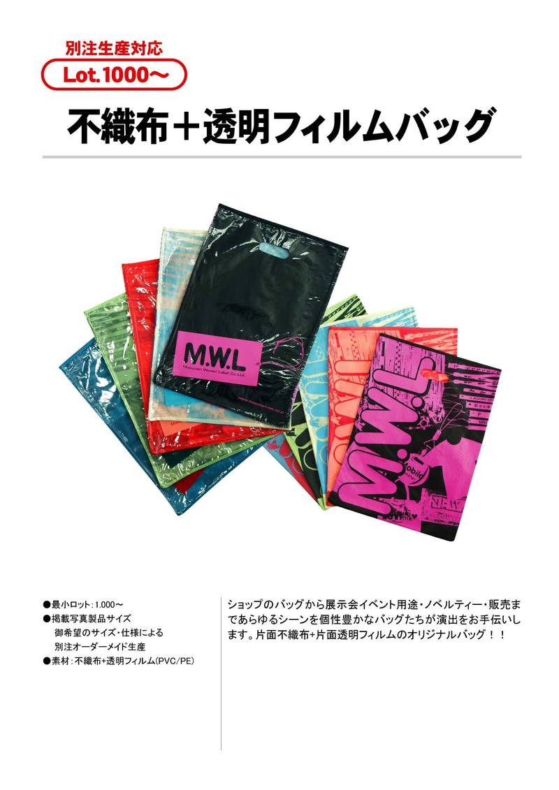 ショップのバッグから展示会イベント用途・ノベルティー・販売まであらゆるシーンを個性豊かなバッグたちが演出をお手伝いします。片面不織布+片面透明フィルムのオリジナルバッグ!!
