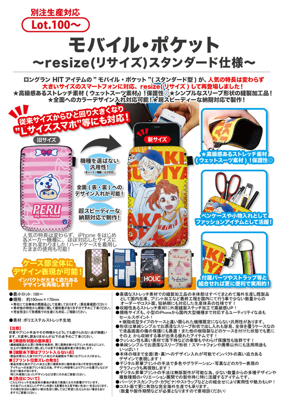 スマートフォンの人気・普及が目覚しい中その周辺アクセサリーグッズにも大きな注目が集まっています!特にその専用ケースはファッションと保護面の実用性もから多くの人が使っている人気アイテムです。そんなモバイル用のケースとしての新提案がこの 『モバイル・ポケット』です!形状はスリーブ形状と至ってシンプル!ですが素材などの工夫により使い勝手や実用性も抜群です!そんな『モバイル・ポケット』を少ない数量からオリジナルデザインでオーダーメード製作致します!
