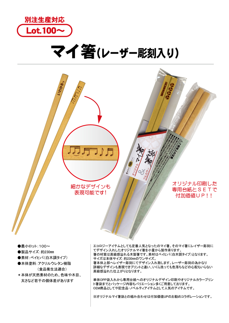 デザイン入れしたオリジナルマイ箸を小量から製作承ります。
