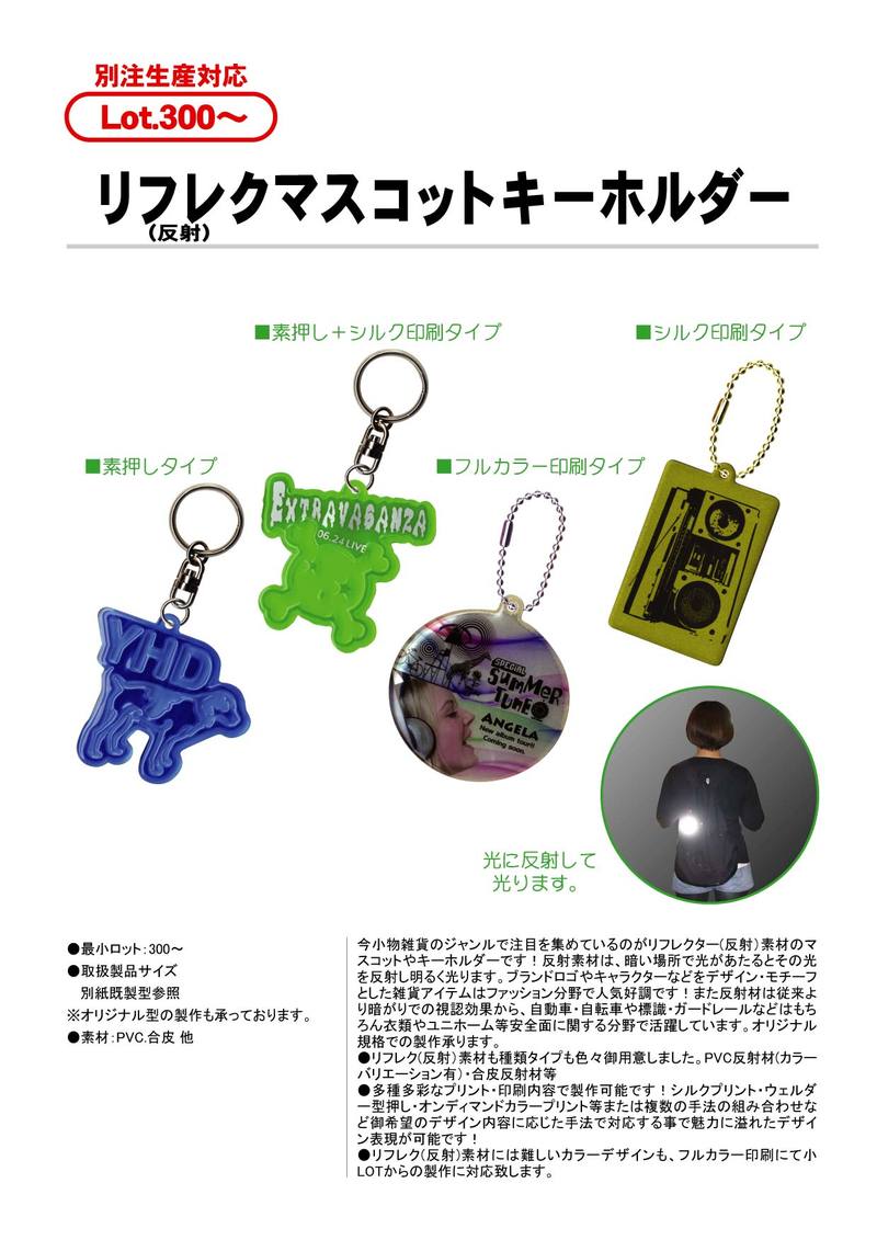 現在、小物雑貨のジャンルで注目を集めているのがリフレクター(反射)素材のマスコットやキーホルダーです!反射素材は、暗い場所で光があたるとその光を反射し明るく光ります。ブランドロゴやキャラクターなどをデザイン・モチーフとした雑貨アイテムはファッション分野で人気好調です!また反射材は従来より暗がりでの視認効果から、自動車・自転車や標識・ガードレールなどはもちろん衣類やユニホーム等安全面に関する分野で活躍しています。オリジナル規格での製作承ります。